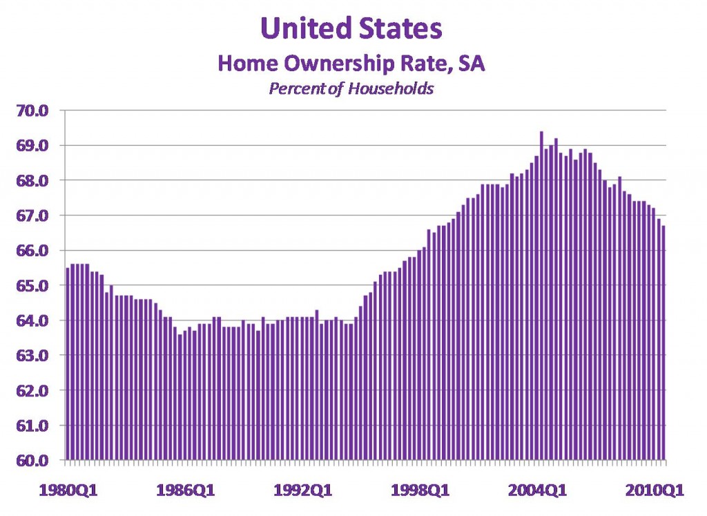 The home ownership rate (percentage of people who own the home they live in) peaked at 69 percent. It has since fallen to just under 67 percent, but we still have a ways to go. It needs to fall below 65 percent for real estate markets to be generally robust.