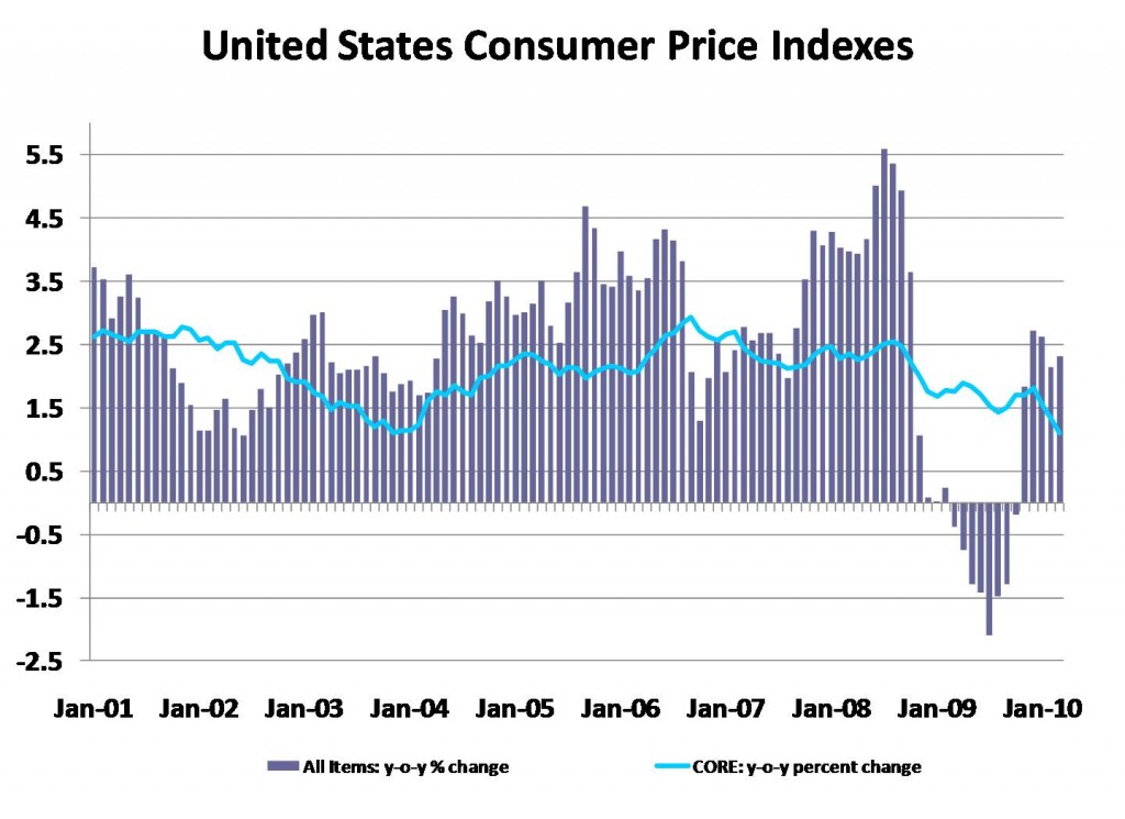 Recent data releases show that inflation remains well contained. In fact, by one key measure, inflation is at a historical low, causing increasing concern about deflation. From the March Consumer Price Index press release we see that first quarter overall price levels have grown about 2.3 percent from 2009 quarter 1. This measure includes energy and food components that are volatile. The Core CPI, which omits food and energy components, is much lower at 1.3 percent year-on-year. The Consumer Price Index measures prices in a way that presumes that households have no ability to switch out of certain goods/services/commodities if their price rises. It measures inflation for a fixed basket of items.