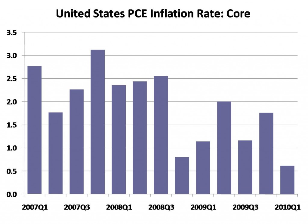 The national accounts Core PCE deflator, a measure of prices that does not fix the basket of items so rigidly, is the measure that the Fed watches most closely in setting monetary policy. From Friday’s first estimate of GDP we also have the first estimate of Core PCE inflation for 2010 quarter 1. It is now at its lowest quarter-on-quarter growth rate since 1959 at 0.6 percent. Charts of these data are included below.