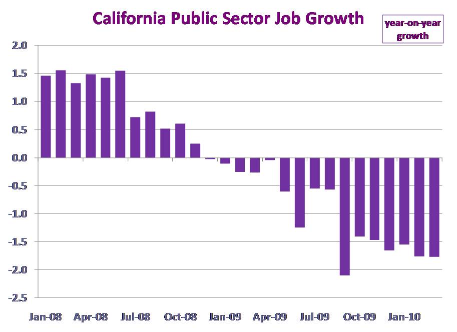 The year-on-year job growth rate continued improving, that is to say the declines are not as big, extending a trend that started in January 2010. Improvements in the year-on-year job growth rates since January have been fairly consistent. The problem is that we started from losses of seven percent. Last year’s seven percent job losses were likely to be the worst in the California’s job market history. The year-on-year growth rate declines were 3.7 percent in February, and 3.1 percent in March.