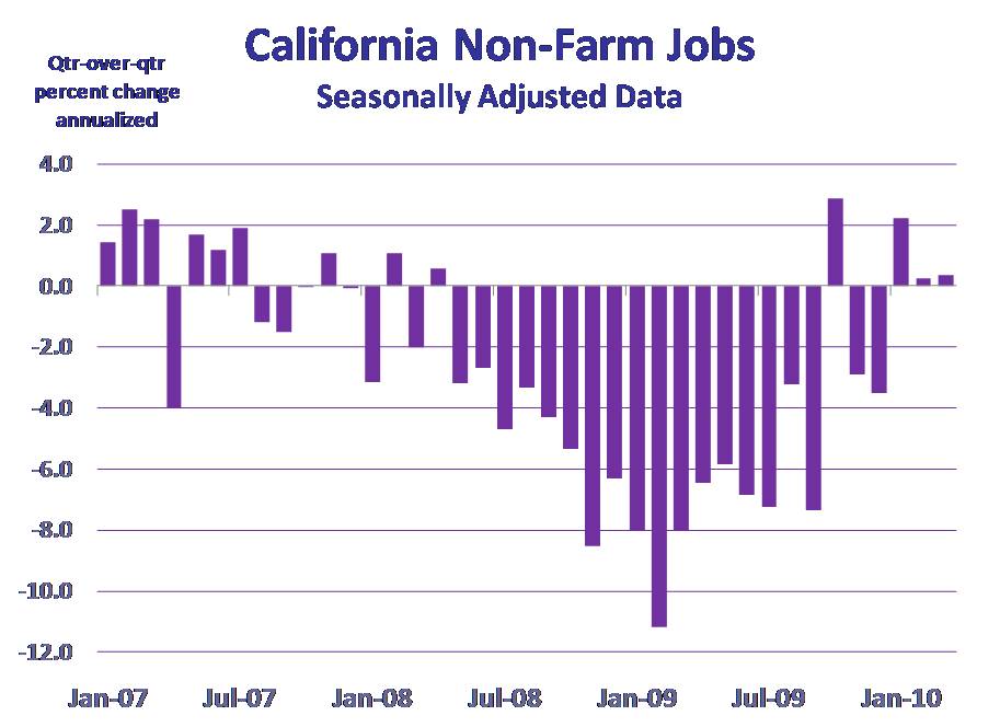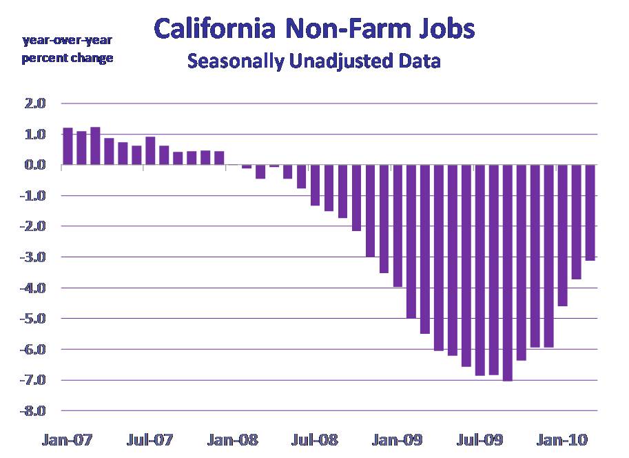 The question of recovery is in the air, and with the March California jobs report we might hope to claim that we are past the worse of the recession. However, even though the job growth decline is improving, the level of jobs is still falling relative to last year. If the rate of improvement in the year-on-year job growth rate continues, we would not arrive at positive job growth until August 2010. As well, the unemployment rate will continue to remain high for some time.