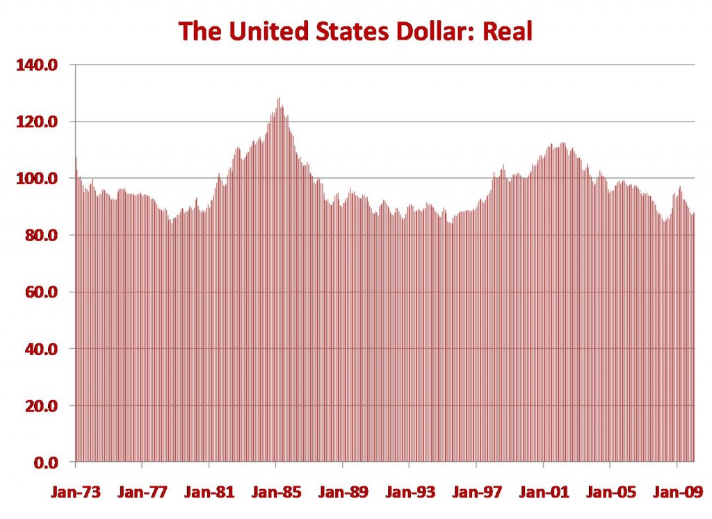 A chart of the dollar’s value, measured in real terms, show that it has been remarkably stable since 1973. The freely floating dollar has not caused a financial crisis since then. This includes, which is highly noteworthy, the major financial upheaval that the United States just went through in 2008. I provide a second chart that shows the same data from January 2005 until now, and we see that from a low in March 2008 the real dollar rose to a recent high in March 2009. This period included the financial crisis. In fact, not only was the dollar stable during the crisis, it rose. Given the experience of the last 37 years, Mr. Friedman’s theory is a good one. I see no reason for the United States to pursue a “strong dollar” policy. All that is needed are responsible short and long run economic policies.