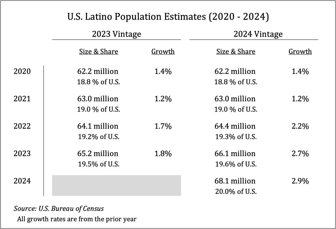 The Census Bureau’s new official population estimates by ethnicity indicate that the size and growth of the Latino cohort are even more auspicious than previously understood. The 2025 U.S. Latino GDP Report, released in April, documented that U.S. Latino population growth accelerated from 1.2 percent in 2020 to 1.8 percent in 2023. The revised estimates still show 1.2 percent in 2020, but 2023 growth is now estimated to be a much more rapid 2.7 percent. The previously estimated 2023 Latino population of 65.2 million has been revised upward to 66.1 million, or 923 thousand more Latinos than previously estimated. (See Table 1.)